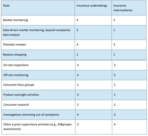 Several NCAs indicated that they would like to adopt mystery shopping activities. According to the information provided by NCAs, the most common supervisory tools used by them to monitor the implementation of the IDD are on-site inspections and off-site monitoring.